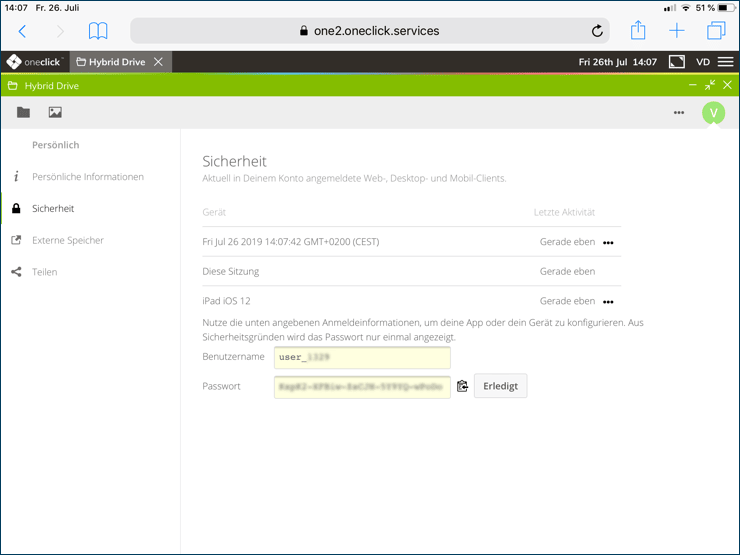 - Wechseln Sie zur Hybrid Drive App, gehen Sie zum Punkt Sicherheit und klicken Sie Neues App-Passwort erstellen.