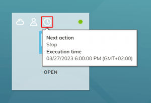Ihr Administrator kann beispielsweise einstellen, zu welcher Zeit die VM gestartet oder gestoppt wird. Welche Aktion automatisch als Nächstes ausgeführt wird sehen Sie hier.