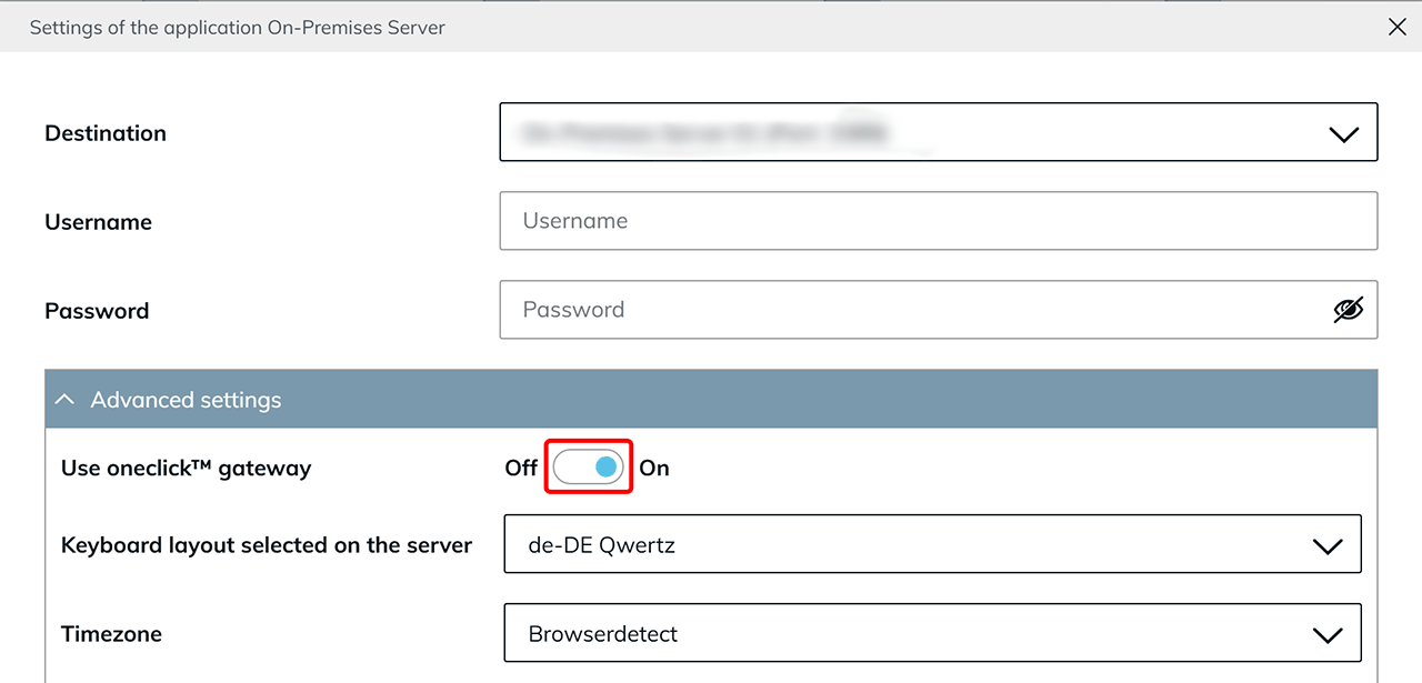 oneclick™ Gateway verwenden Es kann sein, dass Ihnen in „Erweiterte Einstellung“ zusätzlich eine Auswahloption für das oneclick™ Gateway angezeigt wird. Ob diese Möglichkeit besteht, hängt von den Einstellungen ab, die Ihr Administrator vorgenommen hat. Ist der Schiebeschalter Use oneclick™ gateway sichtbar, können Sie selbst entscheiden, ob die Verbindung über das oneclick™ Gateway oder per direktem Streaming hergestellt werden soll.
