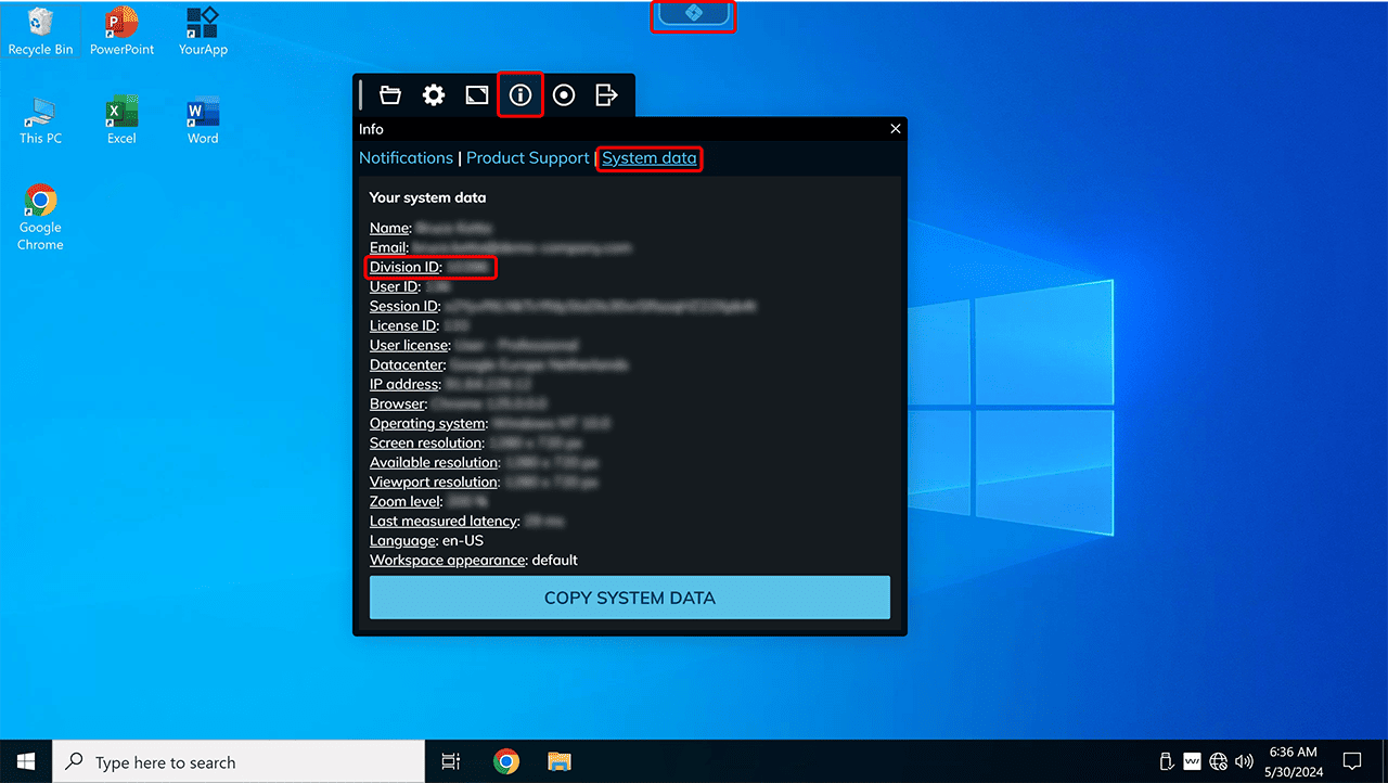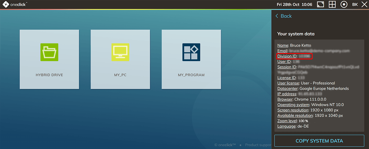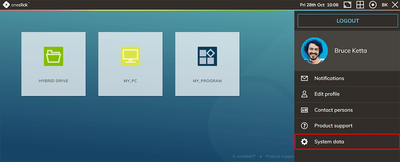 - Im oneclick™ Menü klicken Sie auf Info und dann Systemdaten.