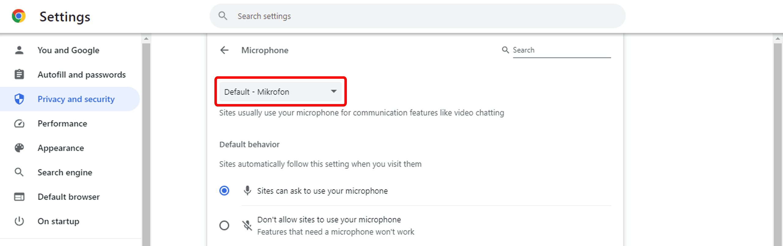 - Ändern Sie die Einstellung des Mikrofon-Standards durch Auswahl eines anderen Mikrofons, indem Sie auf den Abwärtspfeil klicken.