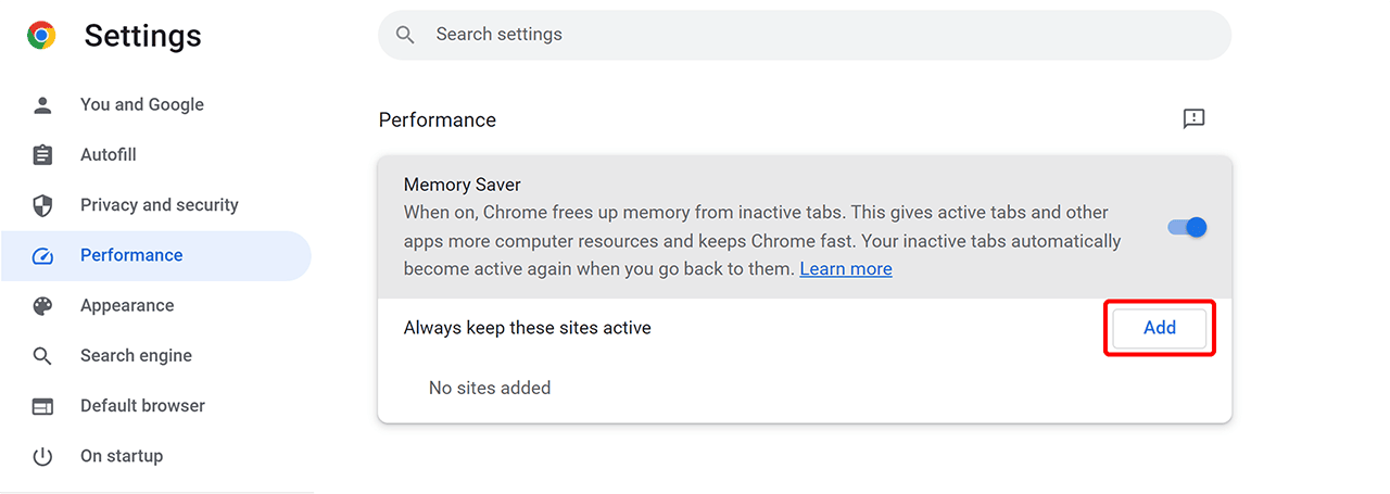- Unter dem Punkt „Leistung optimieren“ finden Sie den Eintrag „Diese Websites nie in den Standbymodus versetzen“.