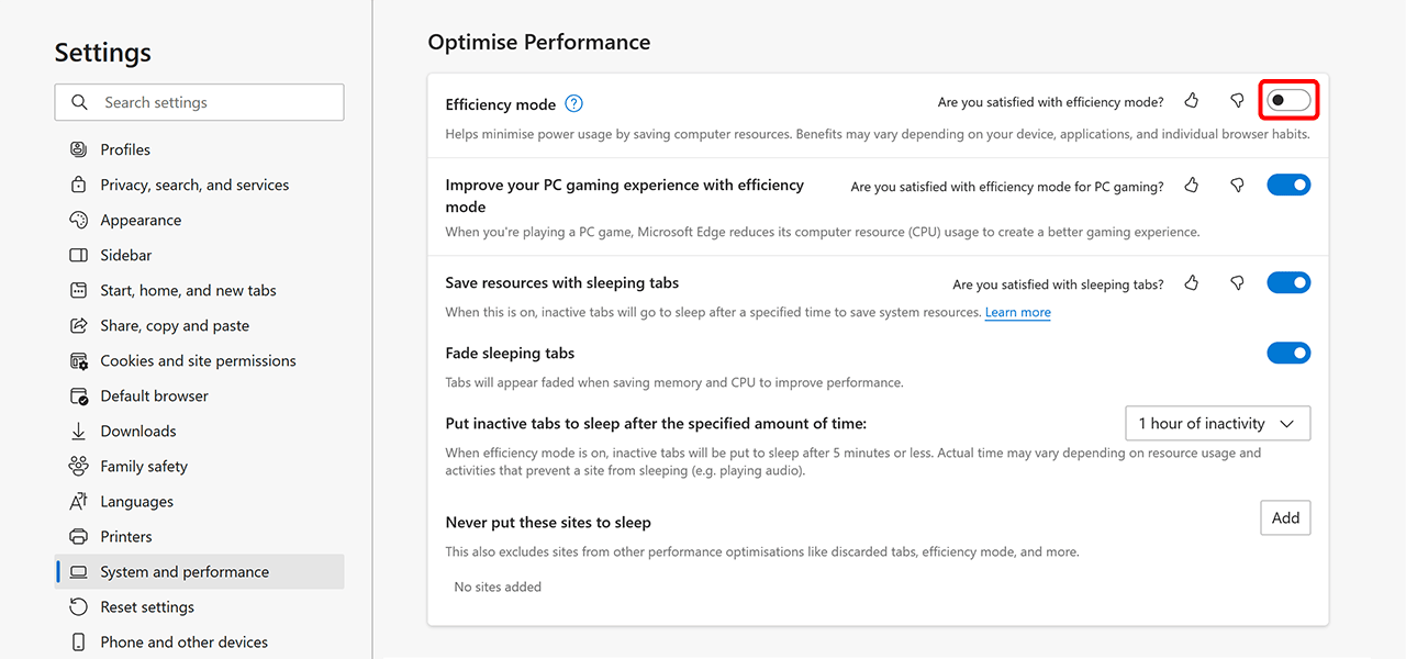 - Möchten Sie das Feature generell deaktivieren, um alle Ihre Tabs im Hintergrund weiter laufen zu lassen, können Sie alternativ einfach den Schalter rechts neben dem Eintrag „Ressourcen sparen mit Tabs im Ruhezustand“ deaktivieren.