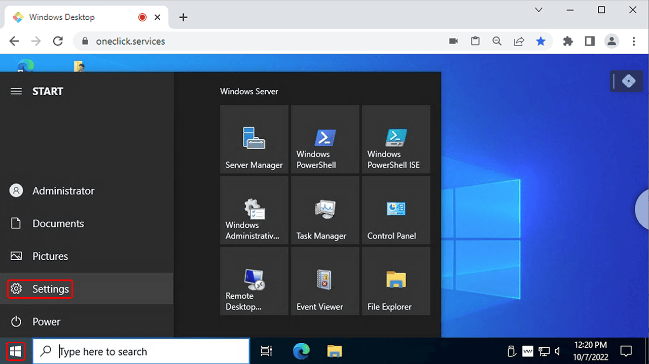 - Auf Ihrem Windows Desktop wählen Sie die Starttaste und klicken Sie auf das Zahnrad-Symbol Einstellungen.