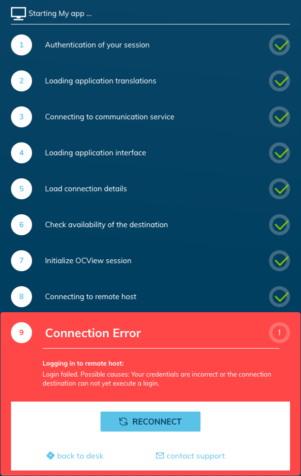 If you receive an error message occasionally or permanently when logging in at start step 9 and the steps 5, 6 or 7 are frozen, proceed as follows: