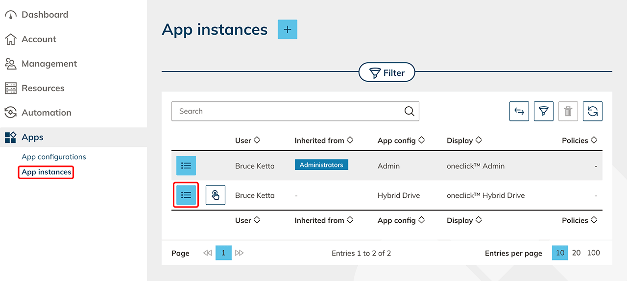 By clicking on "Apps" in the menu and then on the App instances tab you can see all the assigned apps.