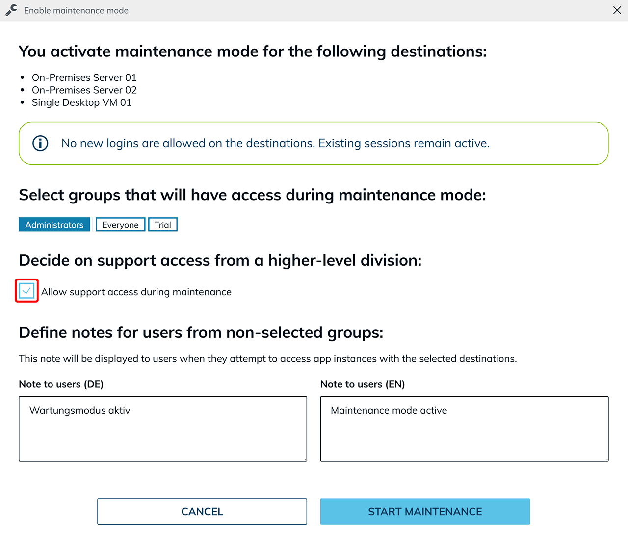 - Option “Allow support access during maintenance” Administrators can now define whether support or administrator accounts from higher-level divisions retain access to destinations while Maintenance Mode is active.