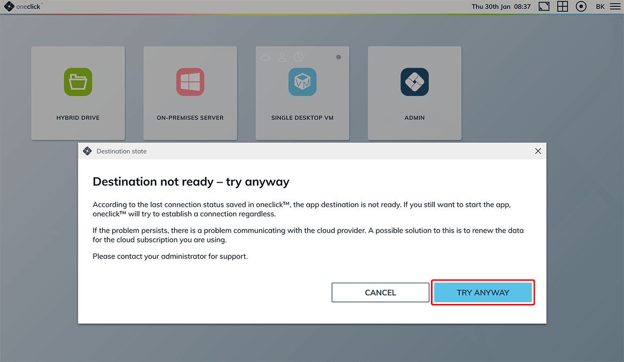 With certain cloud providers, unreliable API responses can occur in rare cases. In order to be able to establish a connection in such situations, we have introduced a new function: You can use oneclick™ to manually initiate the connection establishment, even if the status indicates that this is currently not possible. If you still cannot connect, please check the settings and data of your cloud subscription.