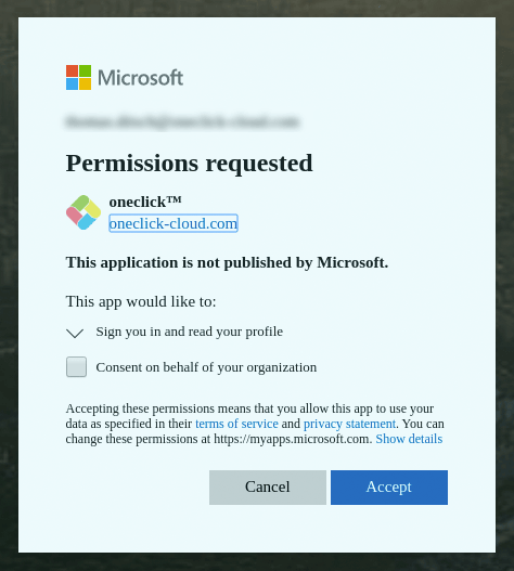 As an admin you can accept the use of Entra ID for oneclick™ once for all users by checking the box next to “Consent on behalf of your organization” and then clicking Accept.