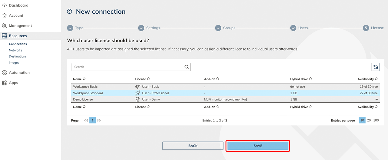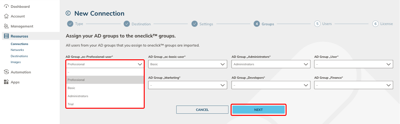 If you need a oneclick™ User license Professional for one part of the users and a oneclick™ User license Basic for the other part, we recommend to put the AD users two different AD groups. Alternatively, you can select the oneclick™ demo license during the AD import (step 8) and assign the correct license to your users afterwards.