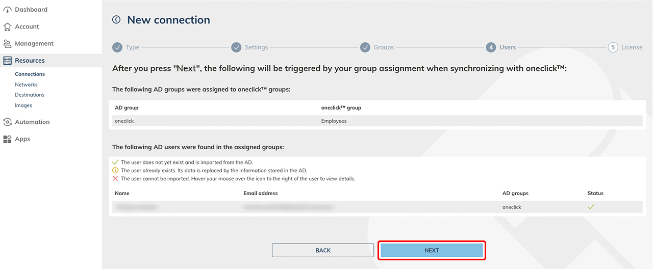 - Check the group assignment and the data of your users that will be imported into oneclick™. Click on Next.