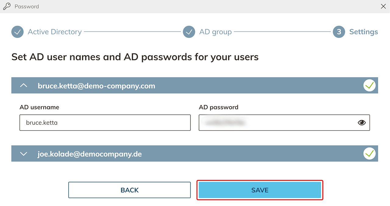 The AD user name and AD password of your users are generated automatically. Optionally, you can change it here. Click on Save.