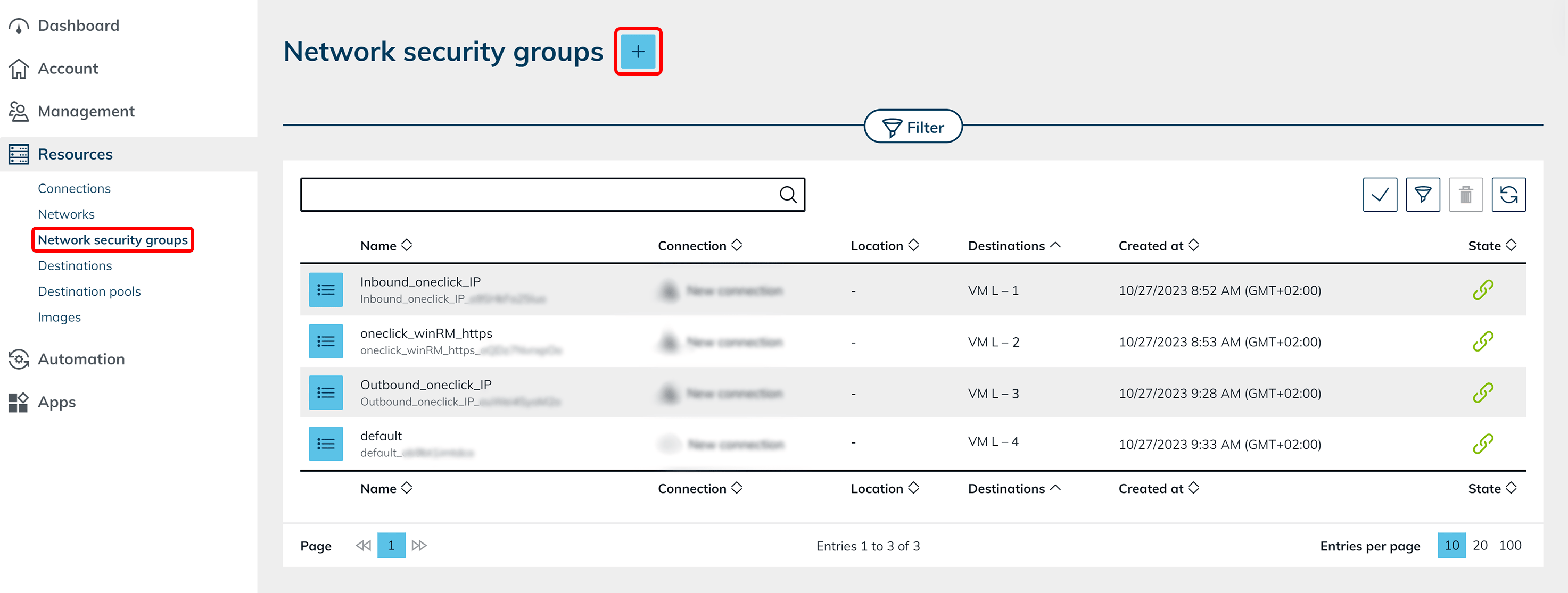 - Your subscription is now connected. Existing networks and VMs are automatically read out and stored in the Resources tab under the corresponding item. If supported byyour cloud provider, oneclick™ will also read out all existing network security groups (NSG) in your subscription.