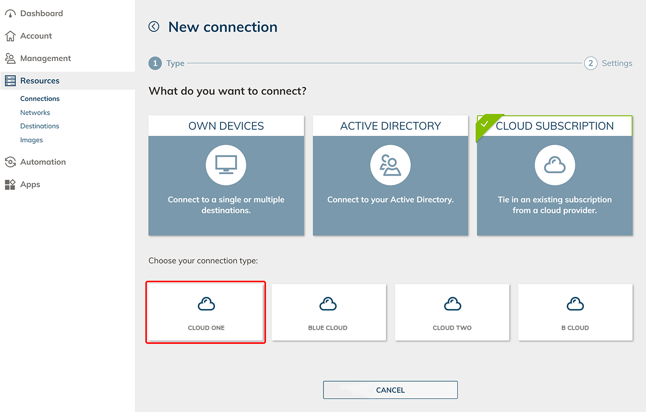 - Select the Cloud Subscription tile and choose the appropriate cloud provider.