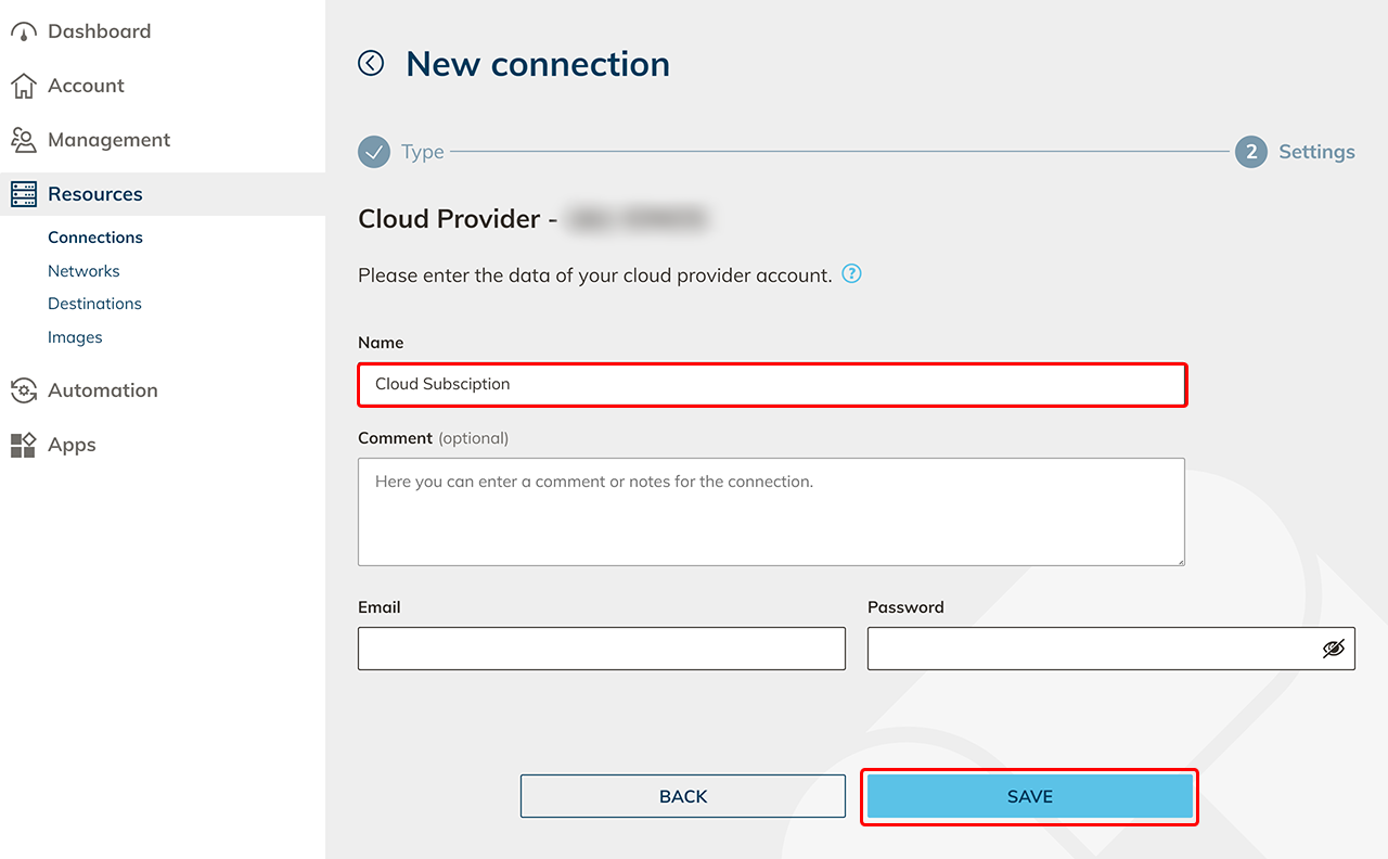 - You will need the data of your cloud subscription. Follow the link to the article of your cloud provider to do so.