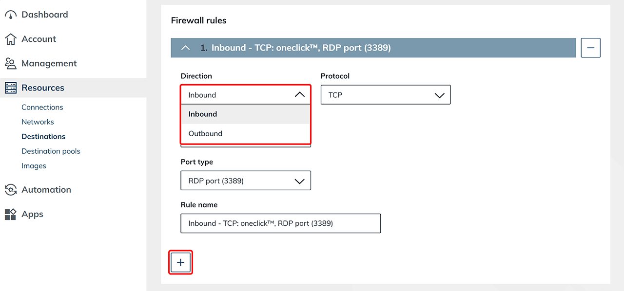 Now create the firewall rules that should apply to this network security group. You can add any number of rules for both incoming and outgoing data traffic using the + Icon. Please note that in order to connect with oneclick™, the corresponding firewall rules must be added for both incoming and outgoing data traffic (if not already done by the cloud provider itself) to make access is possible.