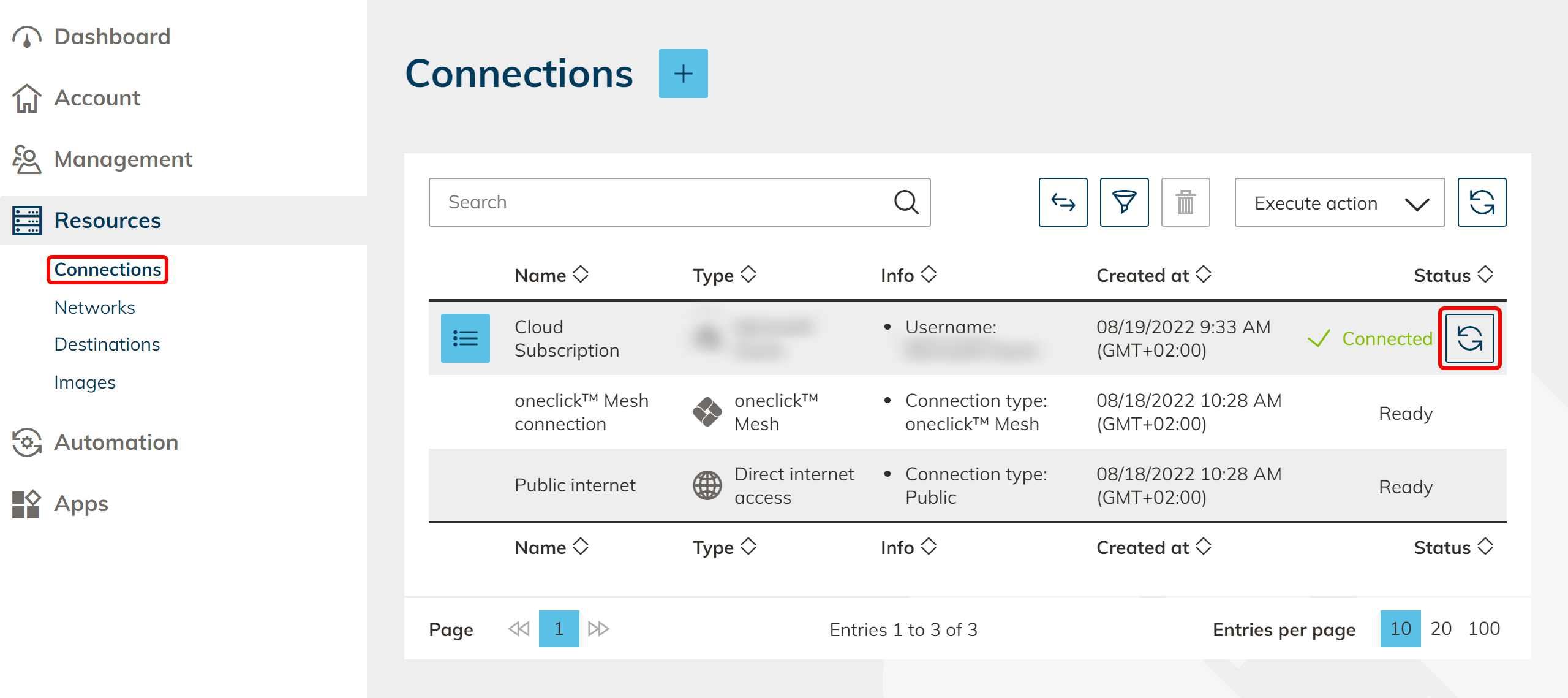 - Click on the Synchronization icon in the row of your cloud connection to read out your cloud resources again.