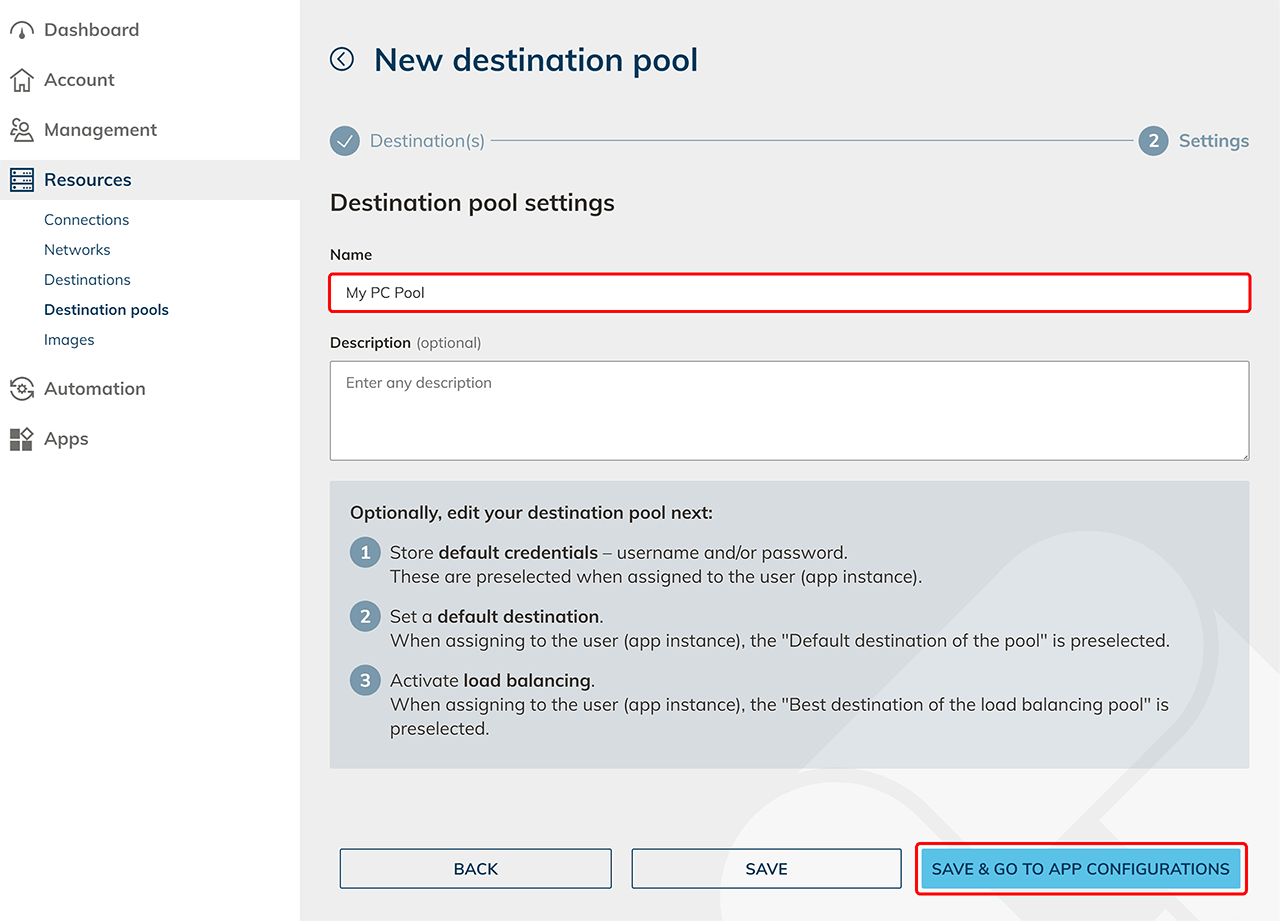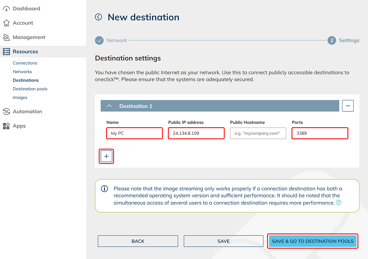 - Assign a "destination name", e.g. My PC. You have to recognize this destination name later.