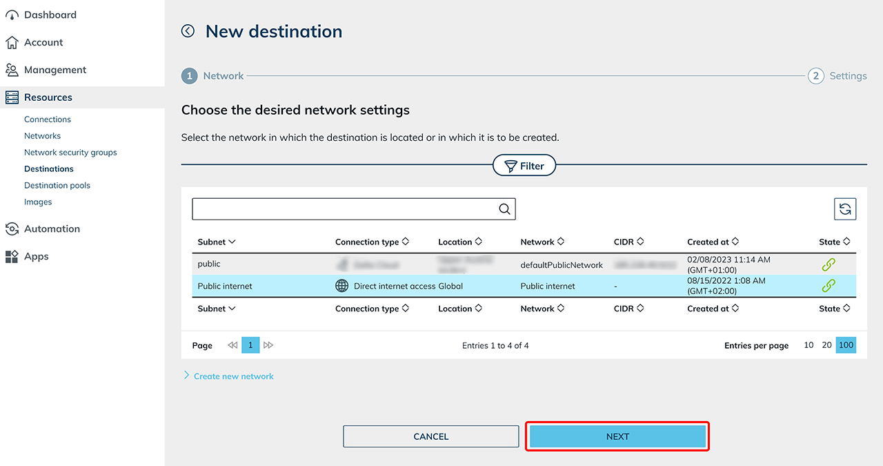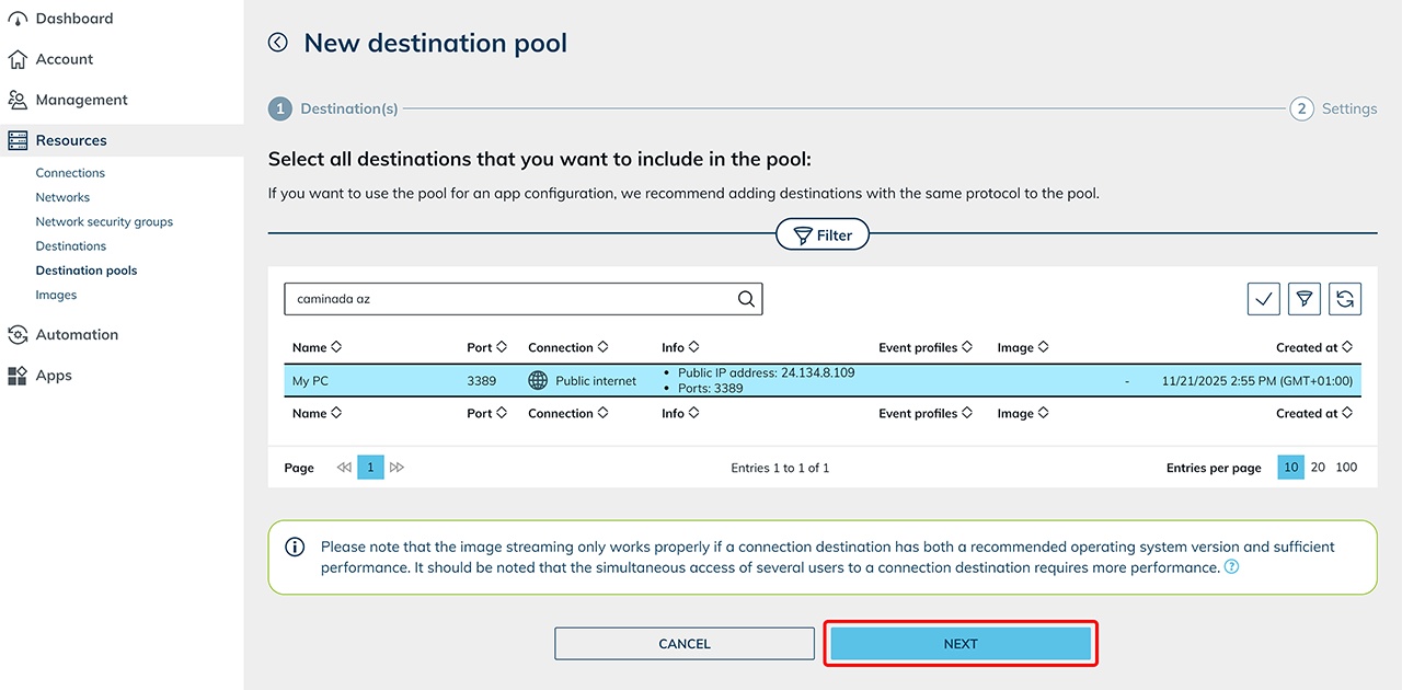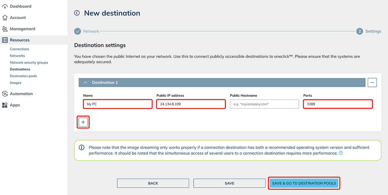 After the network connection has been configured (e.g., via router port forwarding as described in section 2, via port forwarding, or via a VPN-IPsec connection), the device can be created in oneclick™ as a destination.