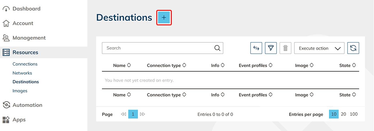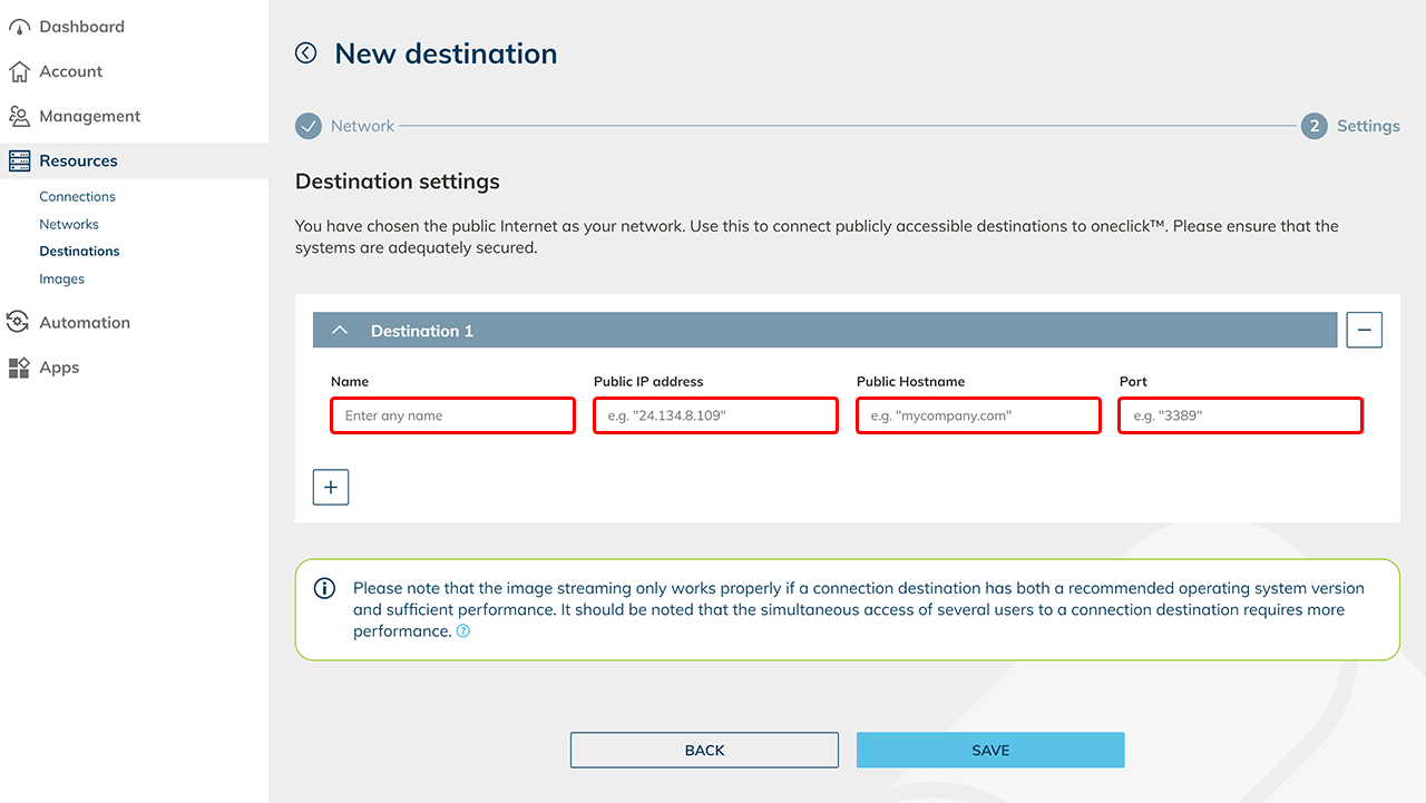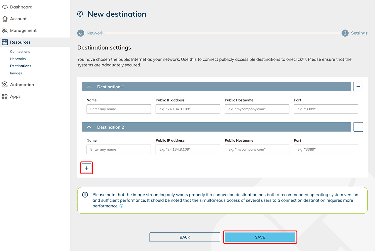 - Start oneclick™ directly via the Resources tab in the Destinations item. Click on the + Icon to create a new target system with direct internet access.