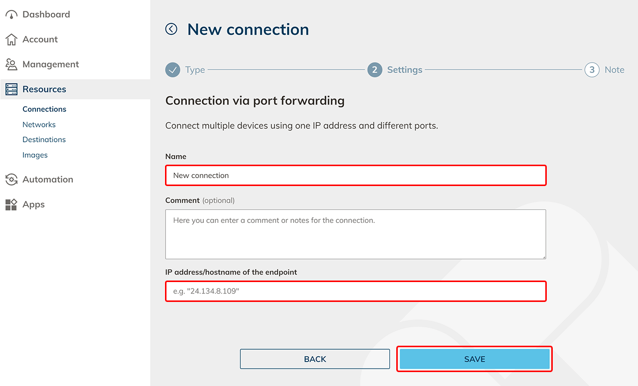 Give the new connection any name and enter the IP address or hostname of the endpoint, e.g. your router. Click Save. A network entry will be created automatically.