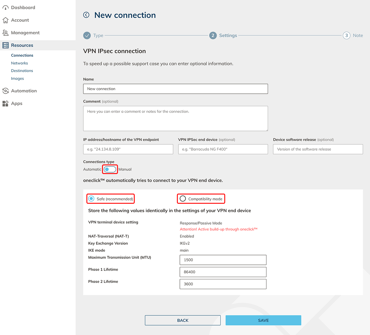 - In automatic mode, you can choose between Secure (recommended) with IKE version 2 and Compatibility mode with IKE version 1. Here, oneclick™ automatically tries to establish a connection with your VPN end device. You can enter the MTU packet size and the lifetime for phase 1 and 2.