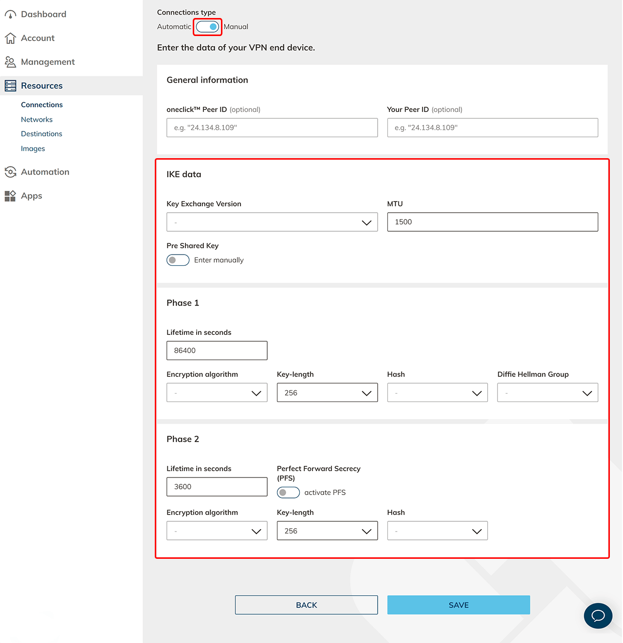 - In manual mode, you can directly enter and select the appropriate data from your VPN end device: