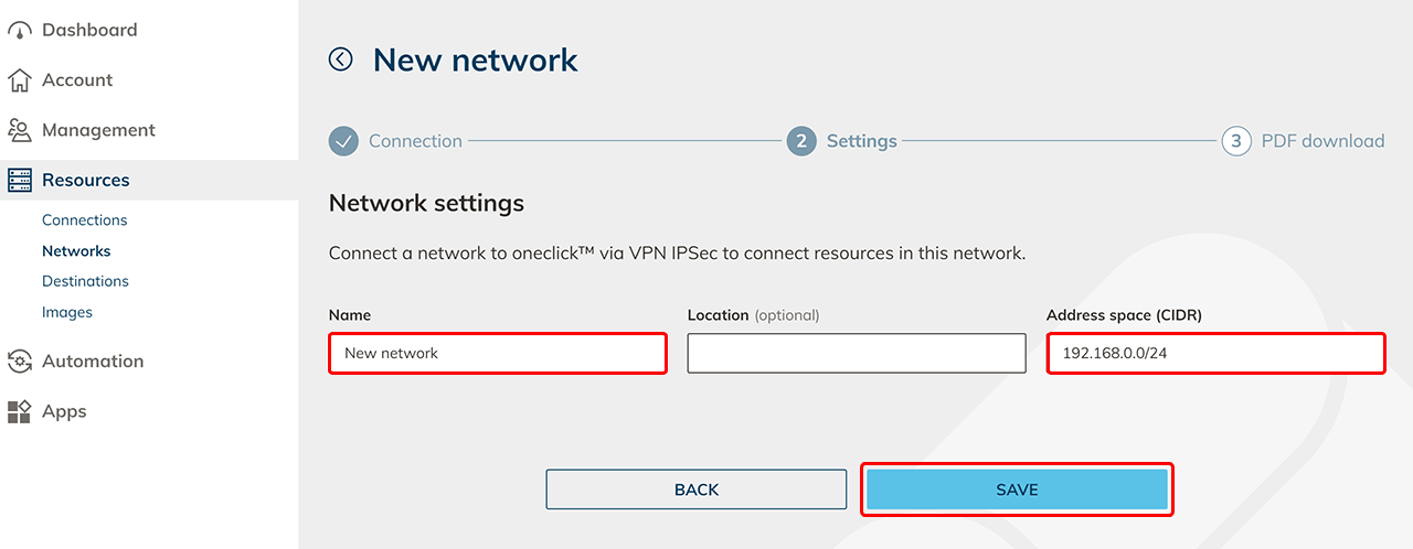 Give the network a name of your choice. Optionally, enter a location, for better overview in tables, and the address space (CIDR) and then click Save.