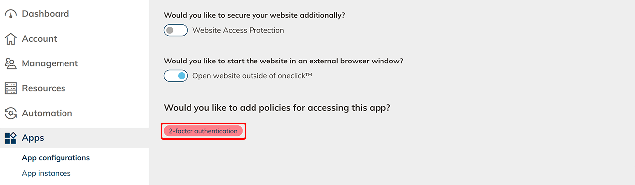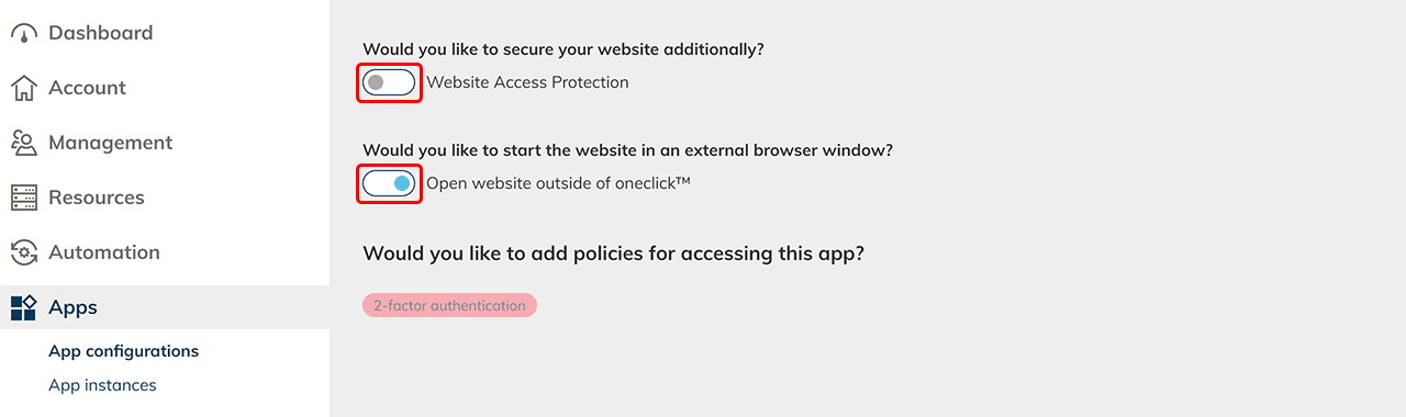 - In the next step you can choose the appropriate configuration type (public Website/App) to access your resources.