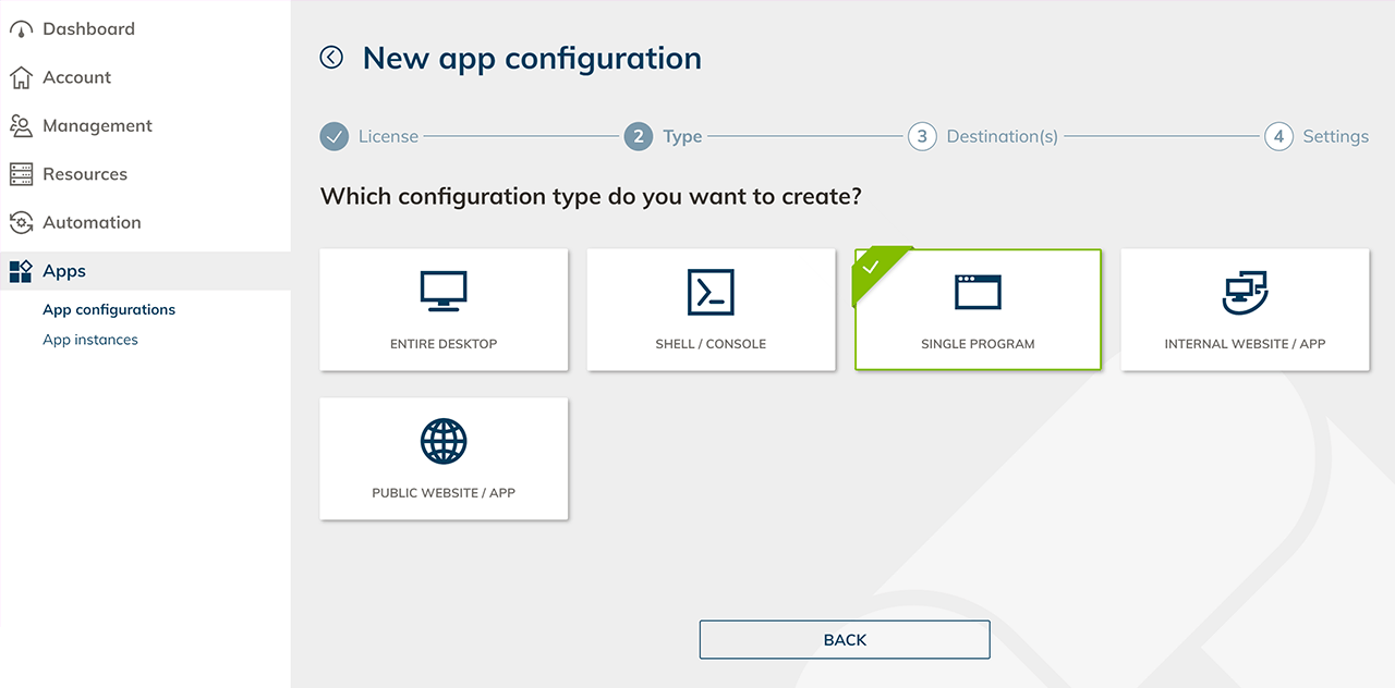 - In the next step you can select the appropriate configuration type (Single Program) for accessing your resources.