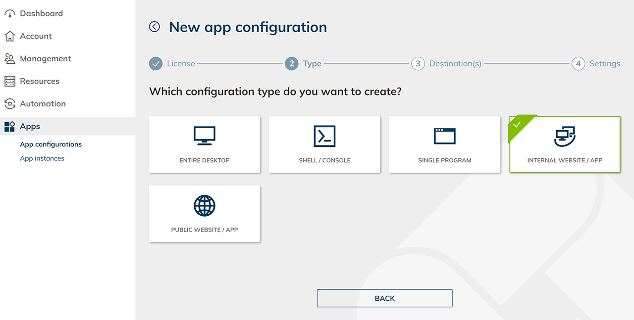 - In the next step you can choose the appropriate configuration type (internal website/app) for accessing your resources.