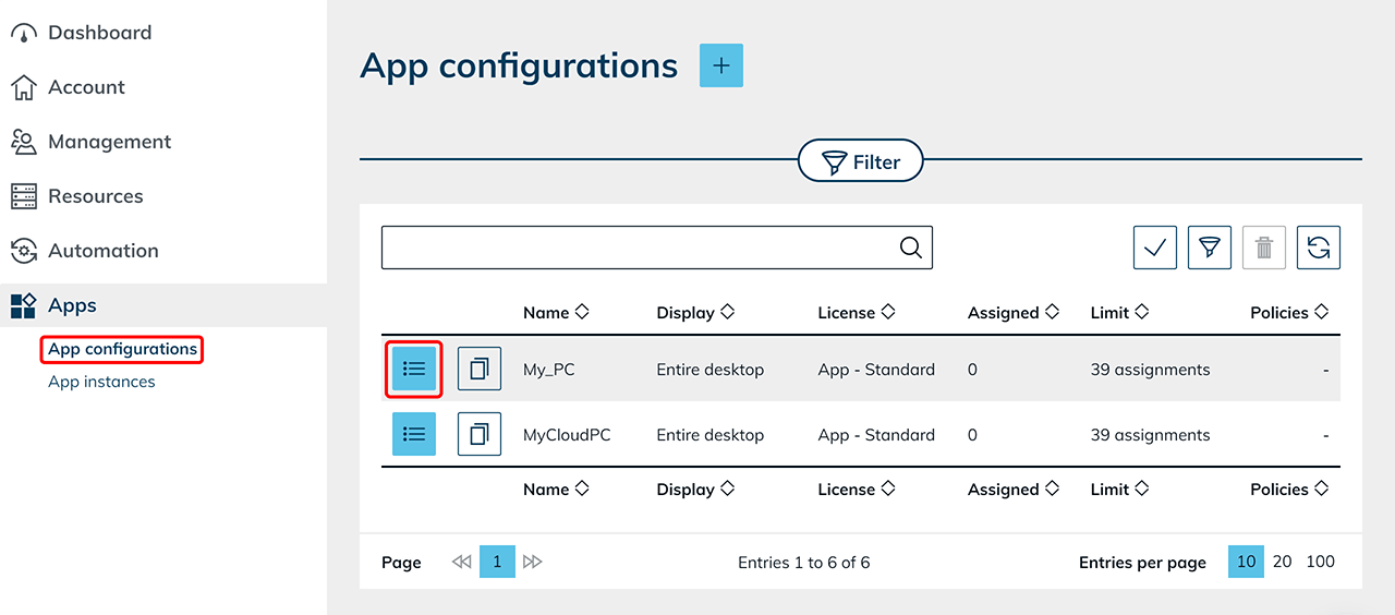 - Select the app configuration in which you want to adjust the settings and click on the List icon.
