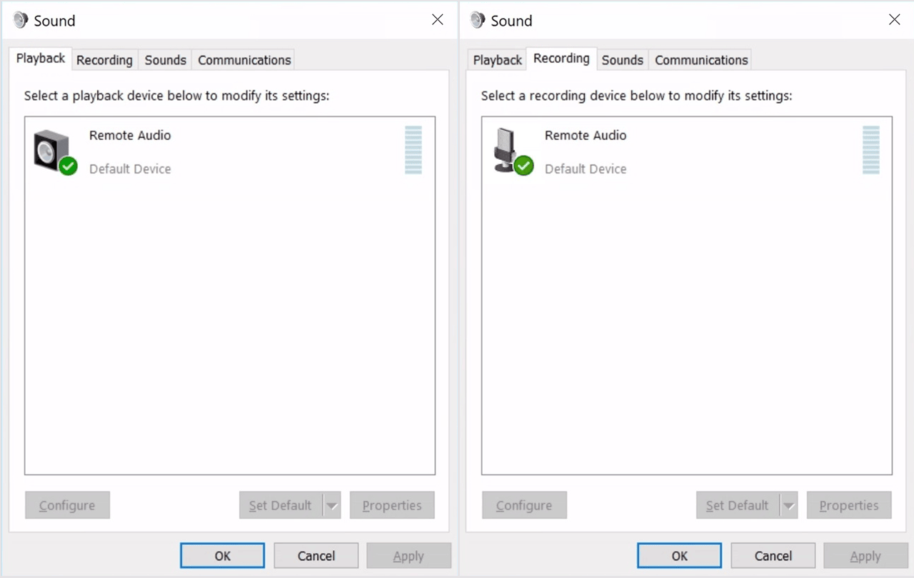 - If you are prompted to activate the Windows audio service, confirm the prompt by clicking Yes. "Remote Audio" is now available as a playback device and as a recording device.