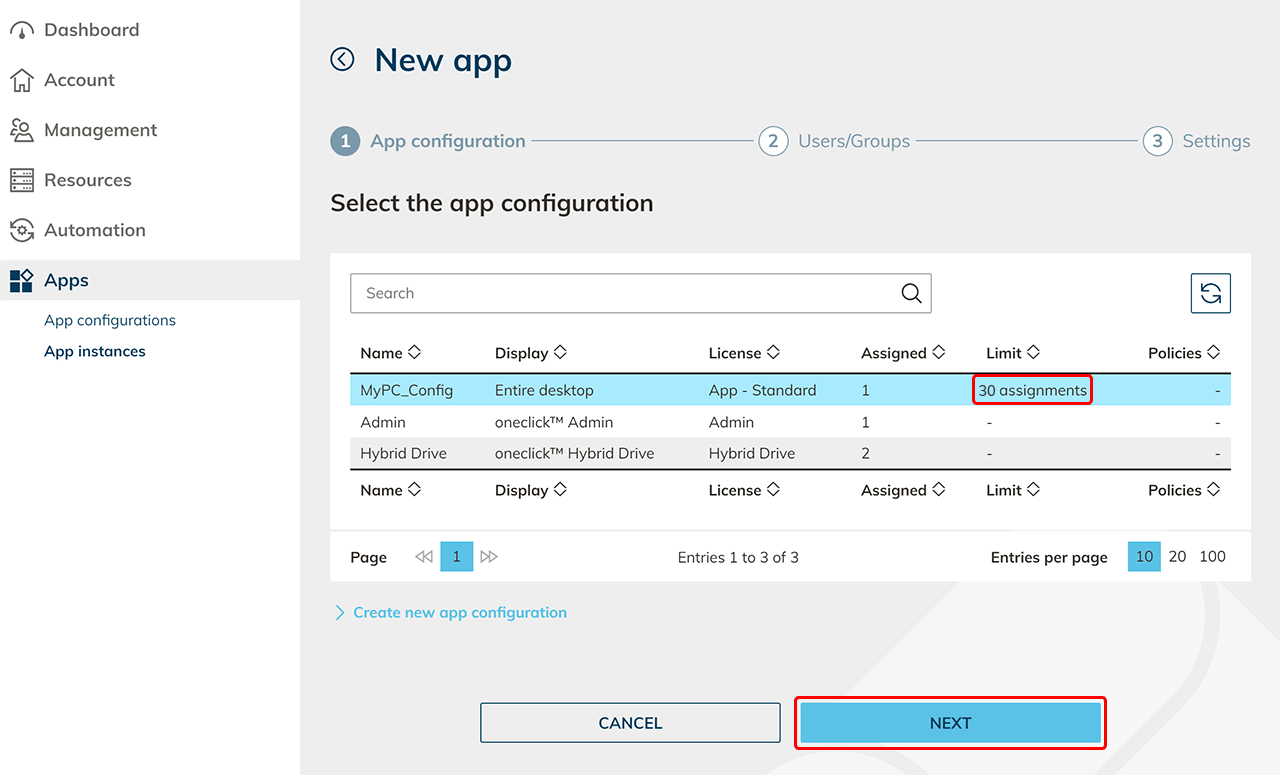 Select the app configuration from which you want to create an app instance and click Next. The app license is stored in the configuration, which determines how often you can assign the app configuration.