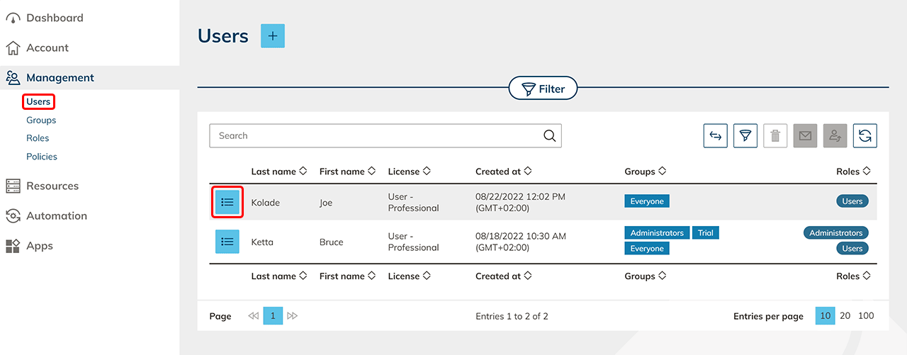 - Click on the Management tab in the menu and then on User. In the line of the user you want to assign apps to, click on the List icon for heading to the details page.