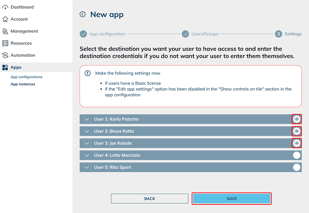 - Now you can make settings for the user per app if necessary. Click on Save.