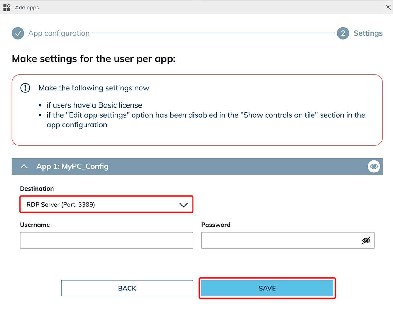 - Now you can make settings for the user per app if necessary. Click on Save.