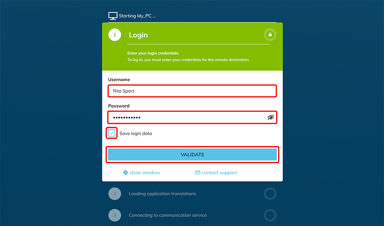 Note that the login data below must correspond to the data set on the destination, e.g. the Windows desktop.