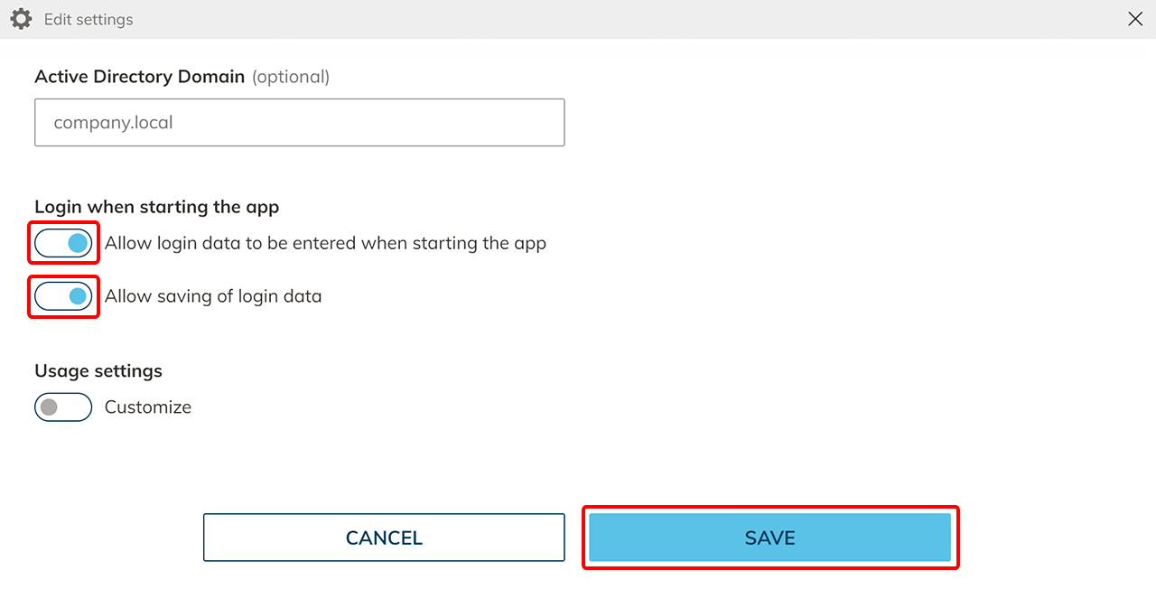 Enable Allow login data to be entered when starting the app and Allow saving of login data. Click Save.