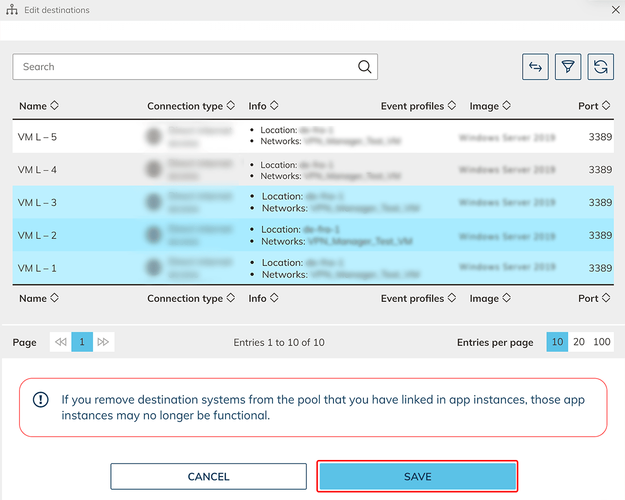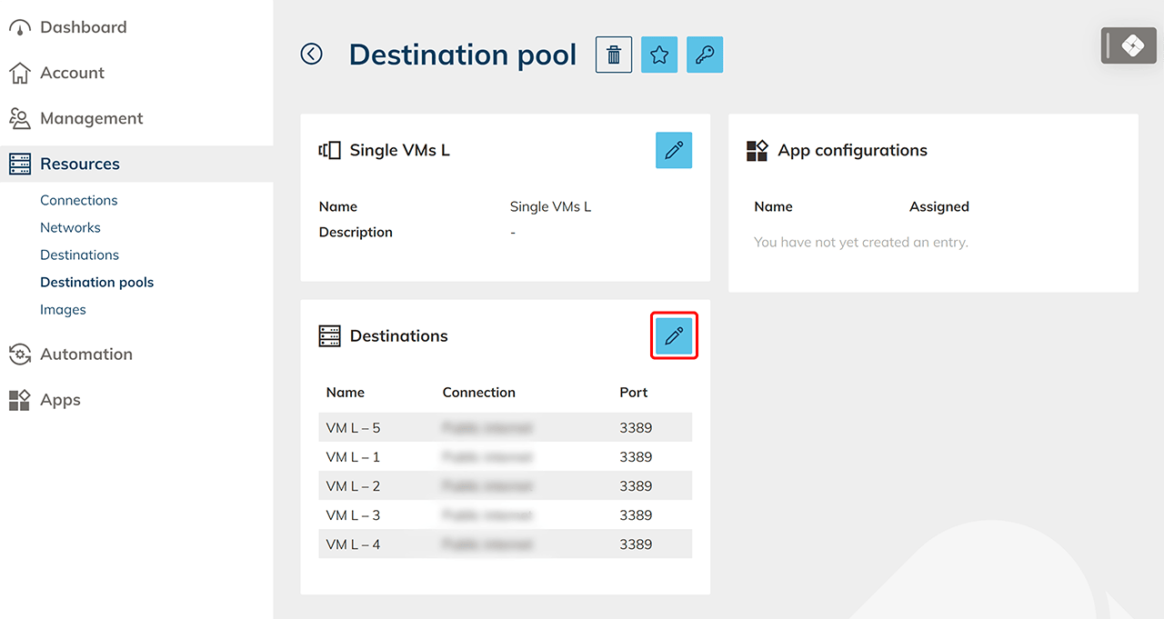 - Select from the list the destinations you want to include in the destination pool and click Next. Make sure that you are only selecting destinations whose ports are using the same protocol. You will use this port to establish the connection to your resource. For cloud resources created in oneclick™, RDP for oneclick™ streaming runs over port 3389 by default.