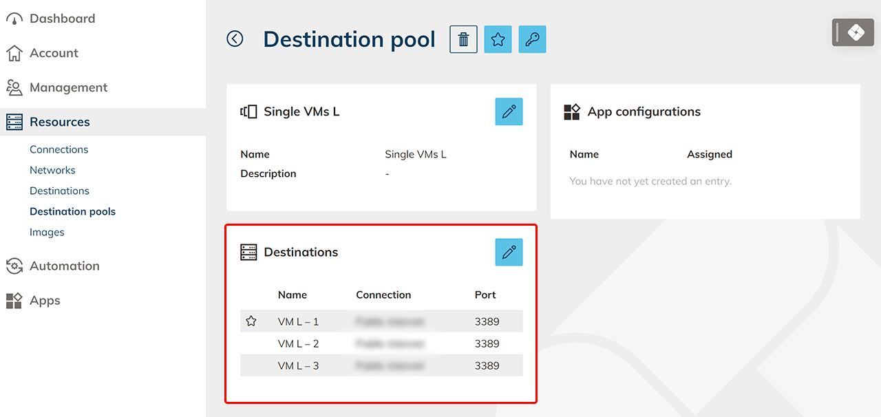 A destination pool is a collection of related destinations to which one or more destinations are assigned, which you can then deliver as an entire desktop, a single program (RDP), or a shell / console.