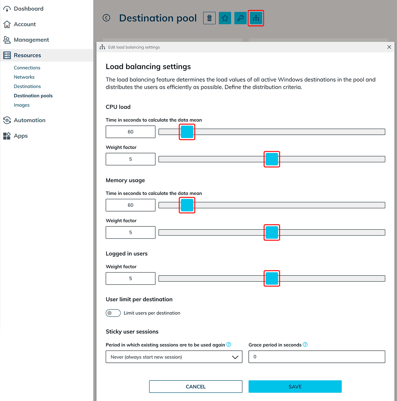 - When using a single user VM, make the appropriate settings and set the maximum weight factor for "Logged in users" to 10. Activate the setting "User limit per destination " and determine the "Maximum number of users" to 1.