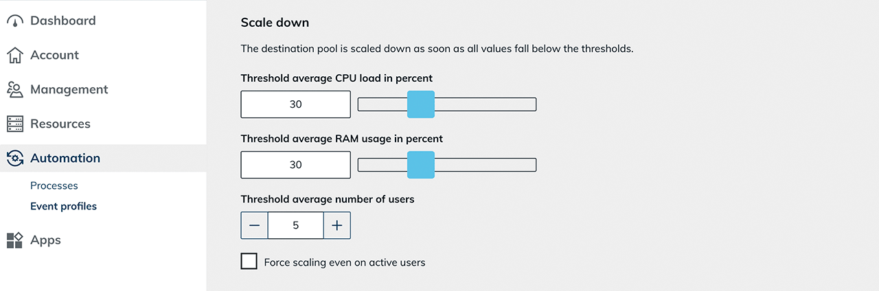 Set a limit for the average number of users. When this limit is reached, the system will scale down.