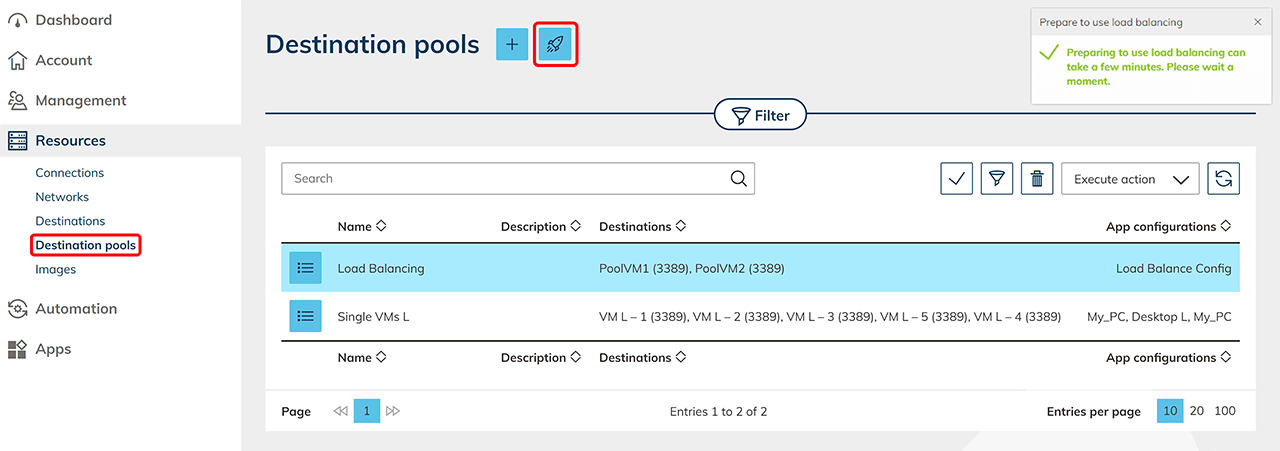 Once you have prepared all the selected resources for process execution, you can enable load balancing in the corresponding destination pool with the following steps.