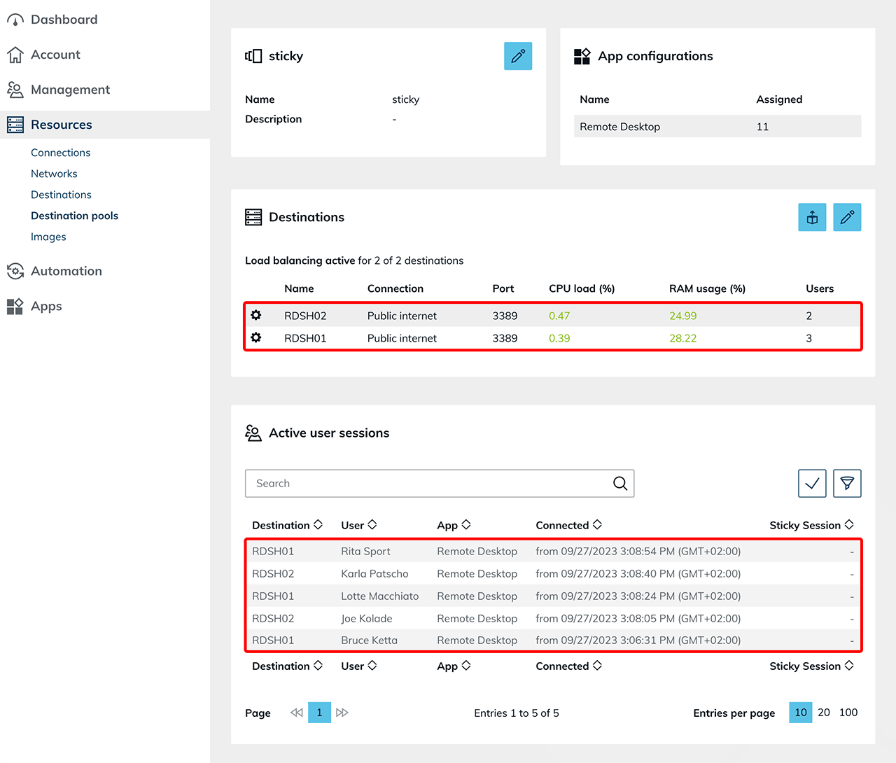 In the tile “Destinations” you can see all resources of this pool. If load data (metrics) is visible in the row of a destination in this pool after load balancing has been activated, it will be taken into account during load balancing. Please note that it may take a short moment until the respective load data can be seen in the table. In the metrics, all users on the server are displayed. Even an admin who logs in via an admin console, for example, is listed here under "Users". In the „Active user sessions“, all users are displayed who have logged in via oneclick™ Streaming and for whom the "Best destination of the load balancing pool" has been selected in the app instance. Here you can see which user was logged in to which server at which time.