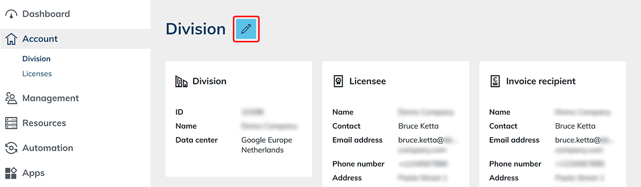 In oneclick™, a division unit is a separately managed unit, e.g. your company, a location or a department with its own cost center and infrastructure. You can find the details of your administrative unit under the item Account. Edit your data by clicking on the Pencil icon.