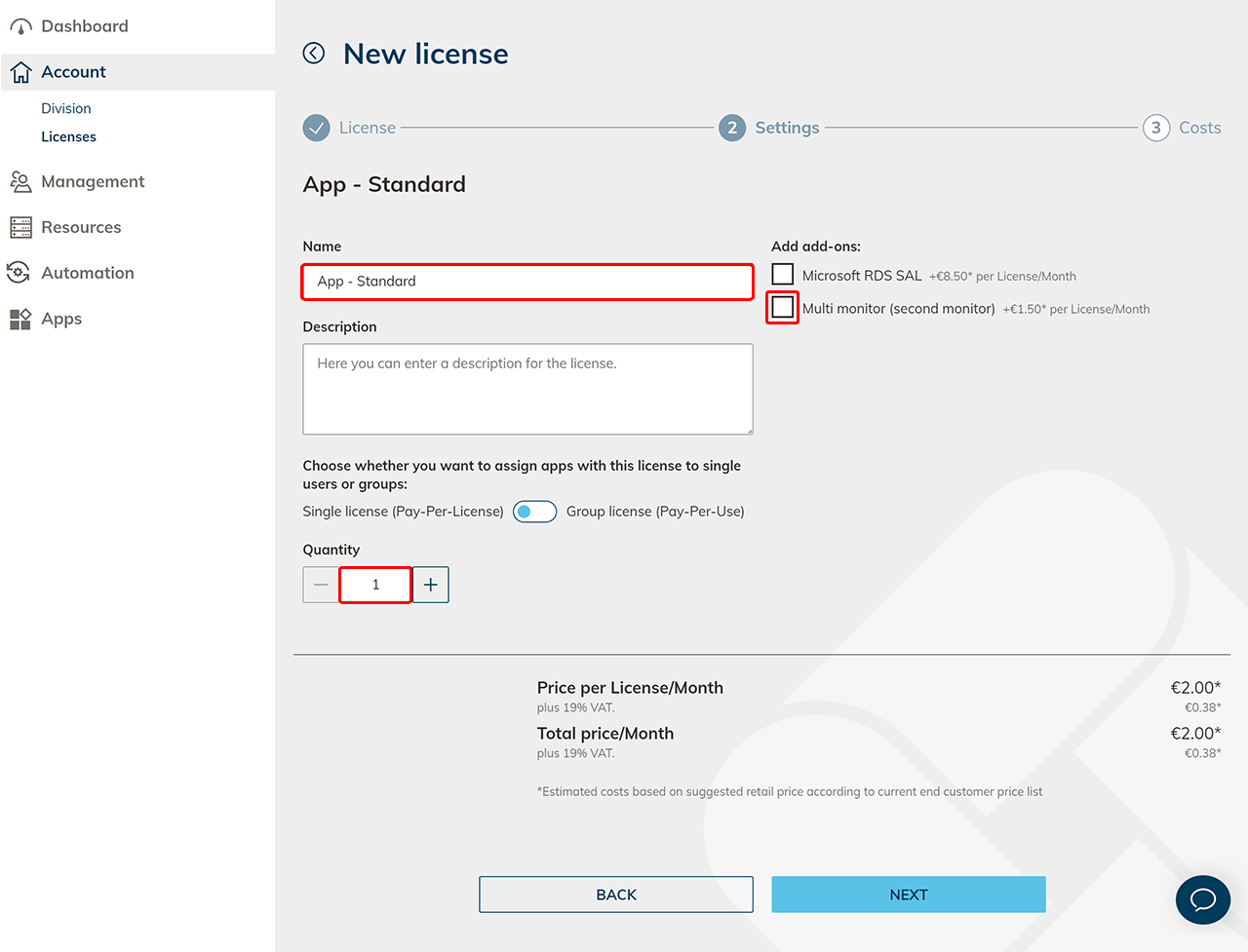 Give the license any name and choose as many app licenses as you want to give apps to your users. For the default app, you can add a second monitor.