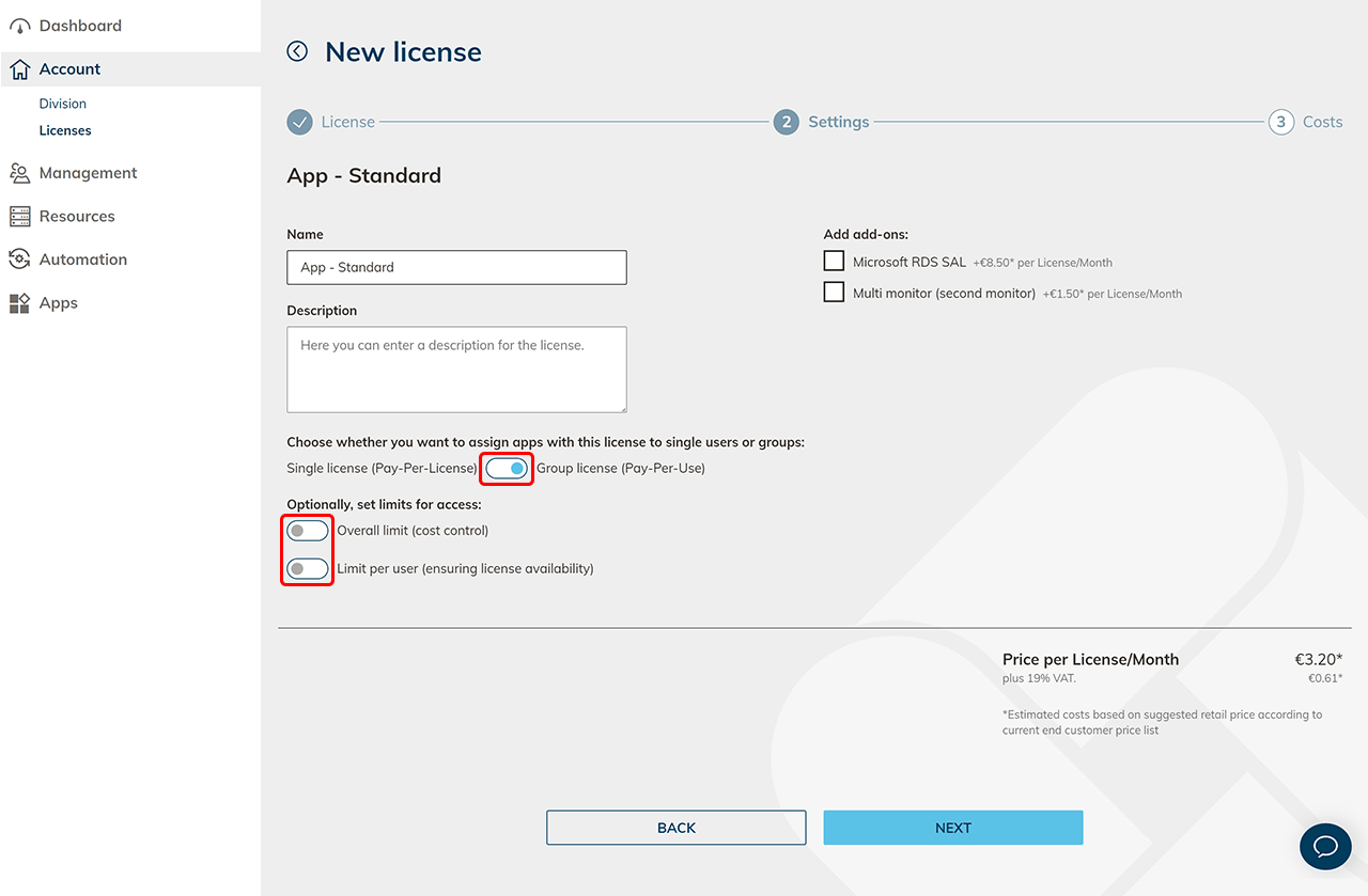 Decide whether you need single (Pay-Per-License) or group (Pay-Per-Use) license. If you have chosen the group license, optionally set limits for group licenses.