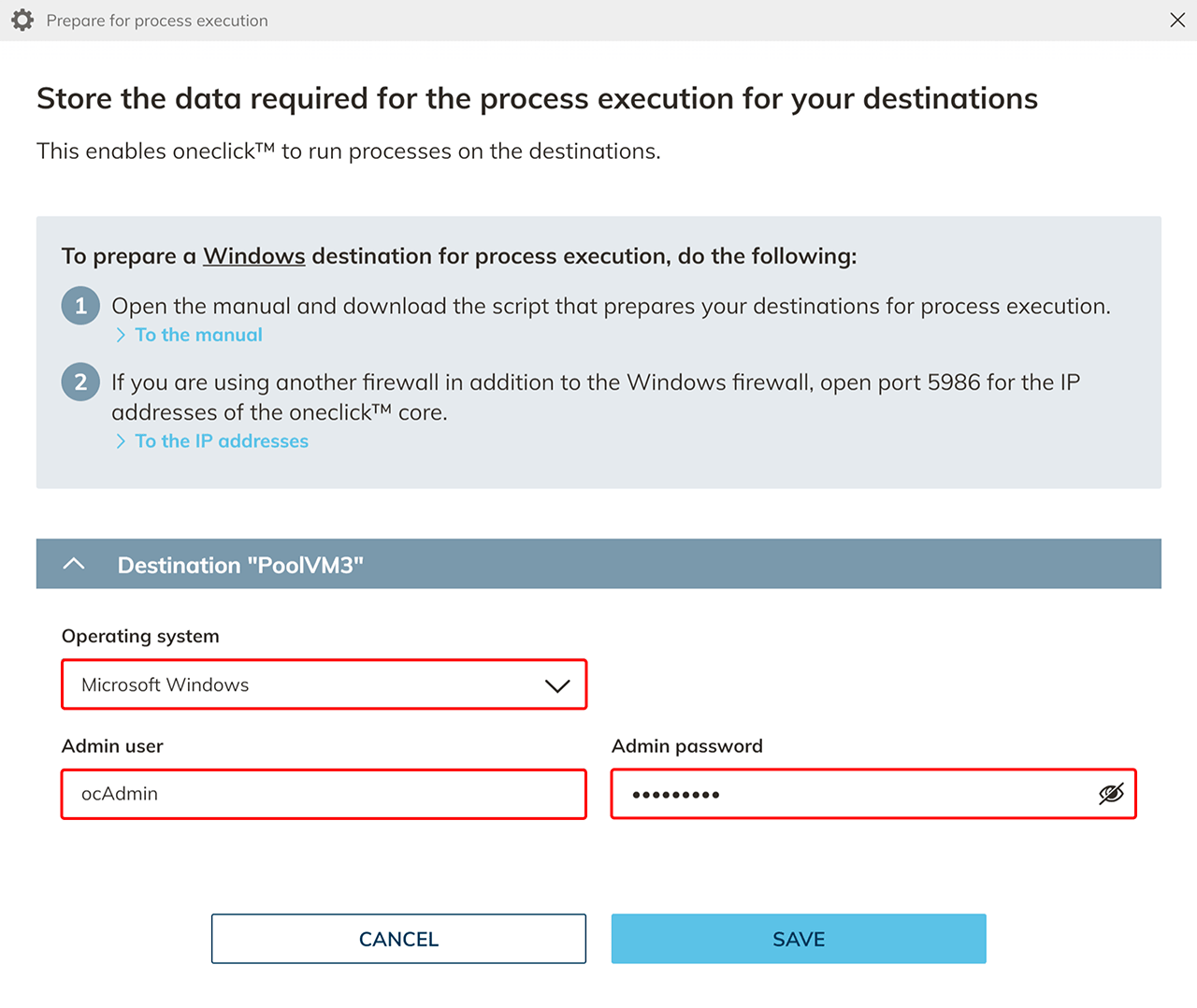 For oneclick™ to be able to execute processes on your destination, Windows Remote Management (WinRM) must first be activated on the corresponding server. In addition, port 5986 in the Windows firewall (and all other firewalls used) should be enabled for the required IP addresses.