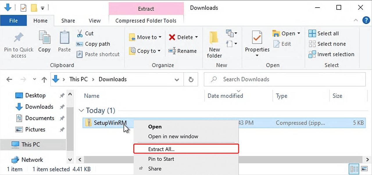 Extract the downloaded file to any location. To do so, right-click and select Extract All…